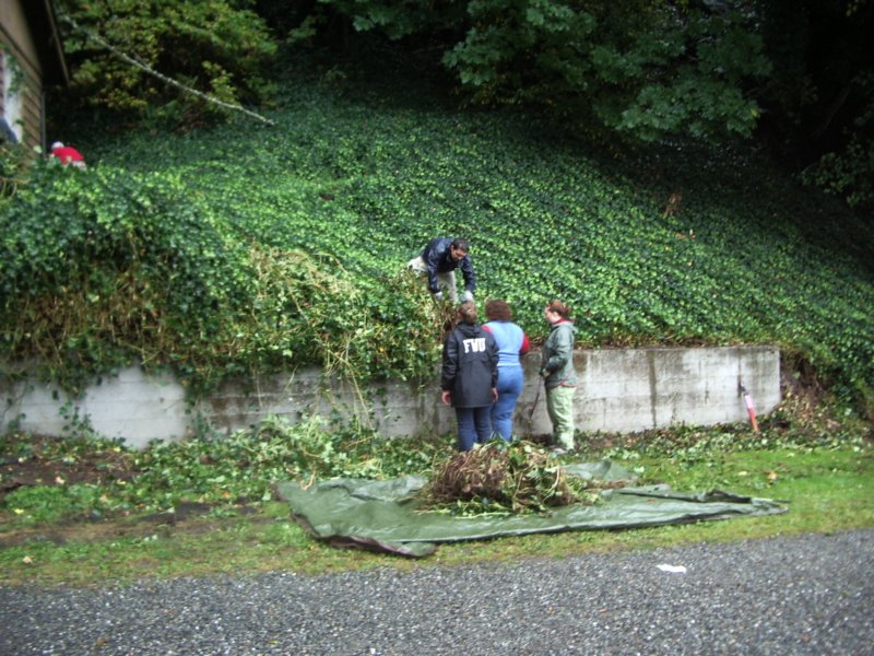 By the time this picture was taken some ivy had already been cleared from the lower wall (you couldn't even see the wall before) and pulled off one window. I should mention that it rained all day, but the turnout was still excellent. What a great group of volunteers.
