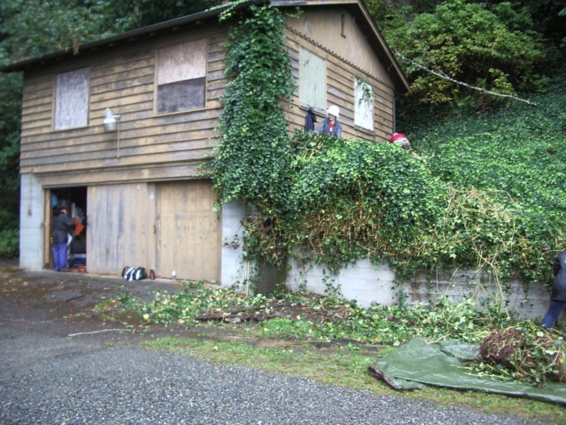 This wall had been completely covered, with the ivy reaching all the way to the ground. You can see in this picture how completely ivy can take over an area like the slope above the wall. There's nothing else growing there at all and that ivy is knee deep in many places. In addition to choking out other plants. ivy is very popular with rats.