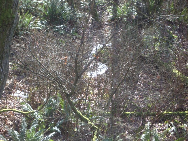 Looking down into the wetlands area from the trail. The "S" shape in the middle of the photo is a water channel. There is additional surface water to the right of it.