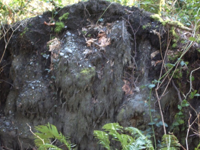 The root wad of a tipped over tree just off the road at point H on the map. This shows how much rock and gravel is just beneath the surface at this elevation. This is above the elevation of the wetlands.