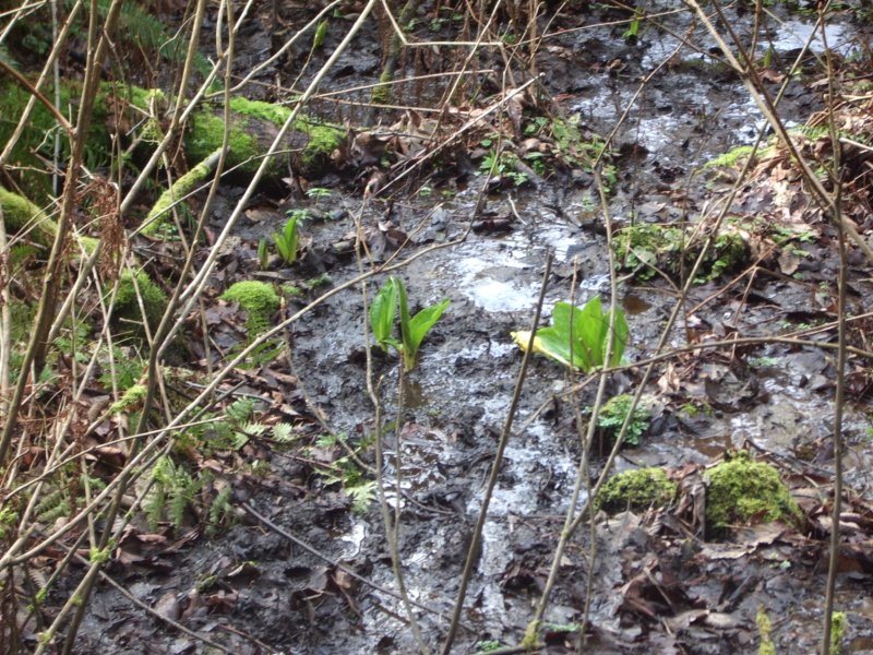 Skunk cabbage in the brush along the trail between the Bridge (Green B) and the beach.