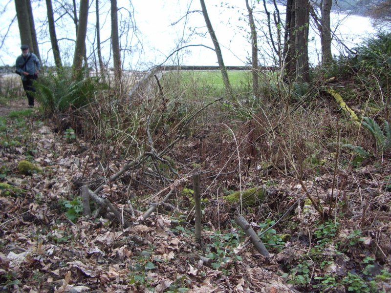 Skunk cabbage growing in an area within a few feet of the beach. This photo is looking west. That's the seawall and Puget Sound in the background.