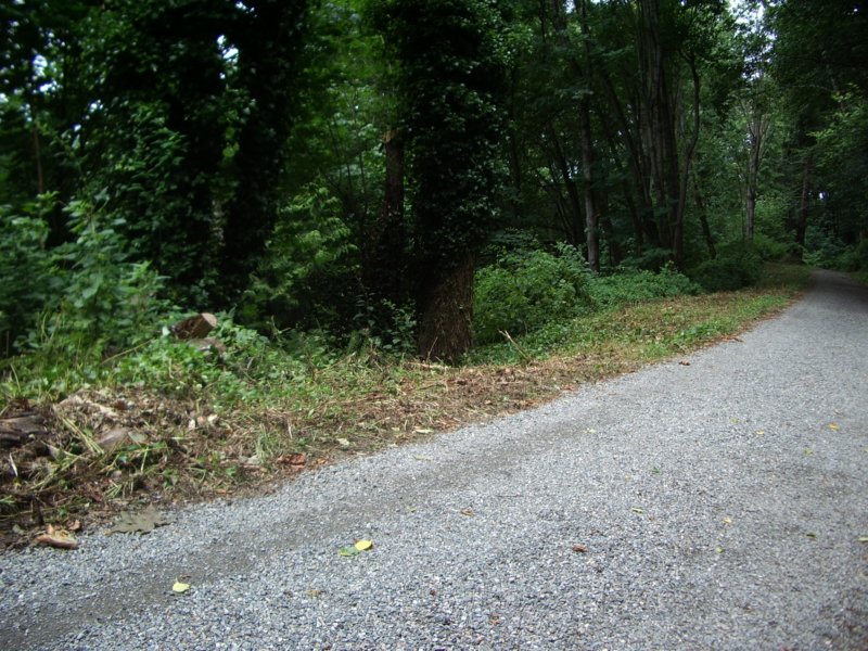 Looking up the road at both pairs of trees. The dark clump to the right is the tree down in the gully.