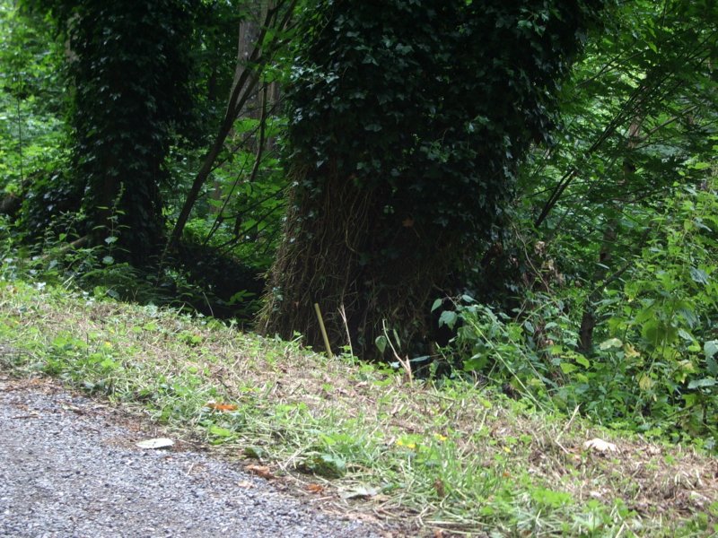 Looking at it from a little farther down the road. The machete does a really nice job of stripping off the leaves. I hadn't finished trimming the left tree of the pair yet, first I had to clear away enough stuff at the base to see where I was stepping so I wouldn't fall off the bank.