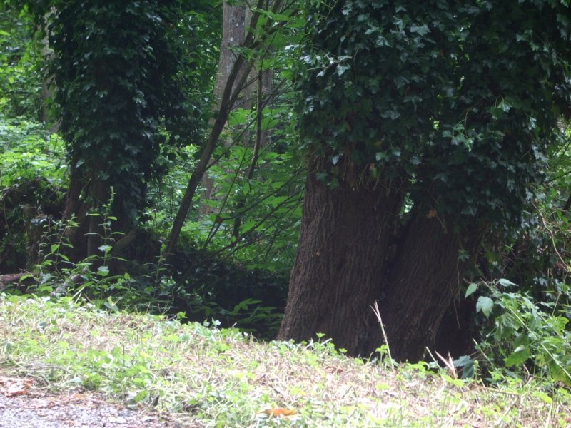 Looking across the road at the left pair after the ivy stems were removed. Before I started you couldn't even see the downed logs or the stump at the base of the trees. Both of these trees are in bad shape with huge sections of bark peeling off of them. The right pair is just visible on the edge of the photo.