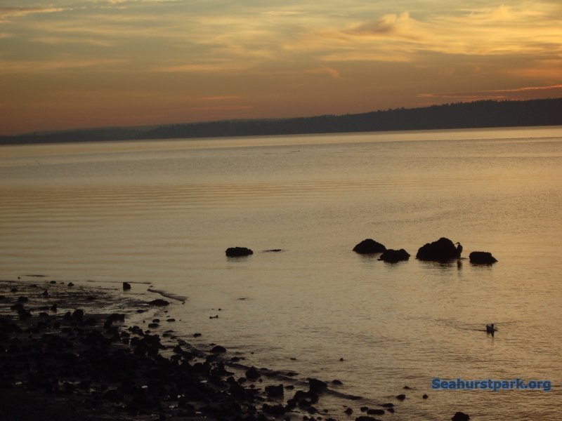 4:14 PM December 5, 2008. Midway up the north side of the park about 5 minutes before sunset. You can see the silhouette of a heron on the right side of the largest rock, and a duck swimming towards the beach.